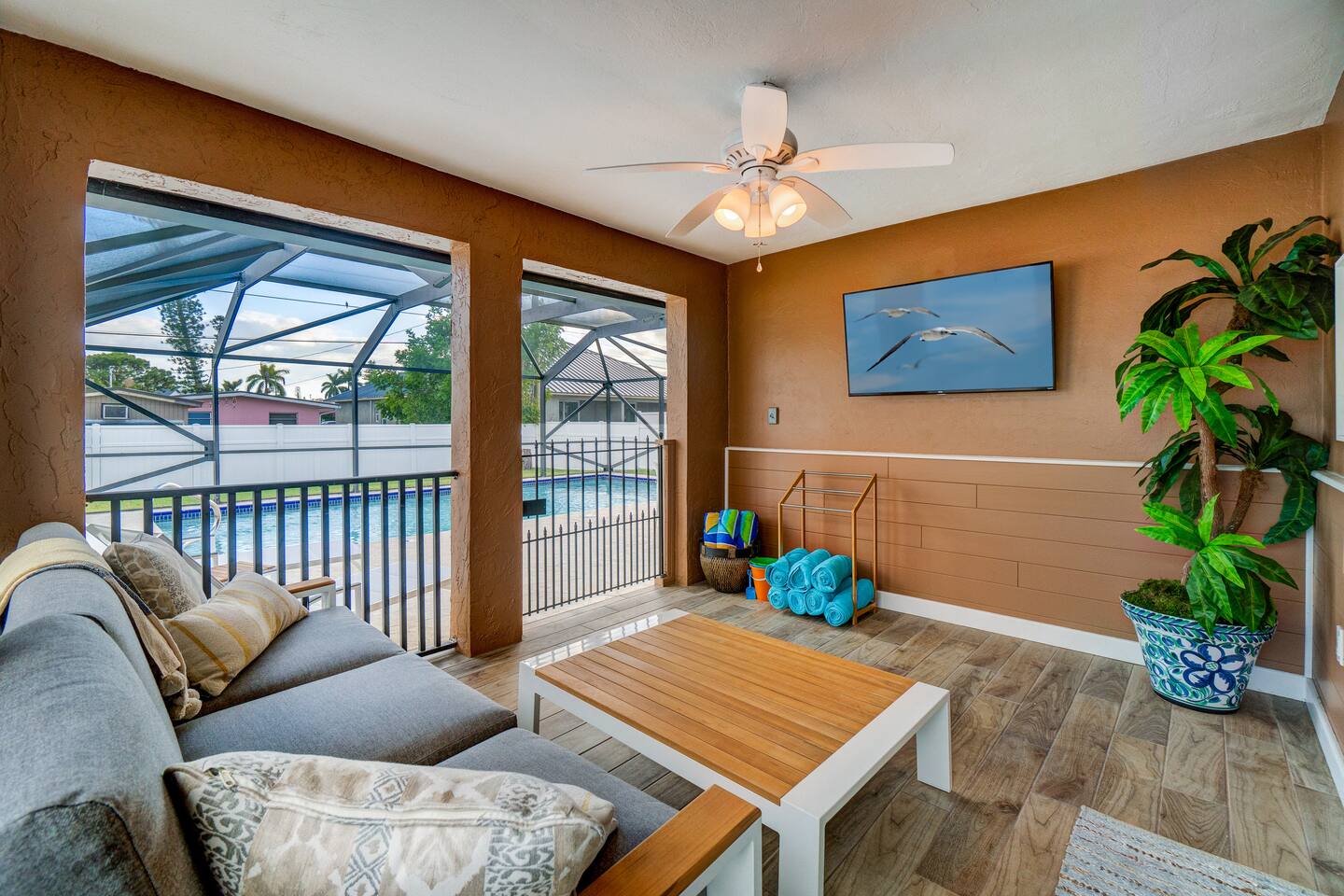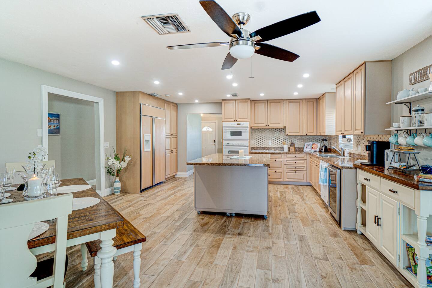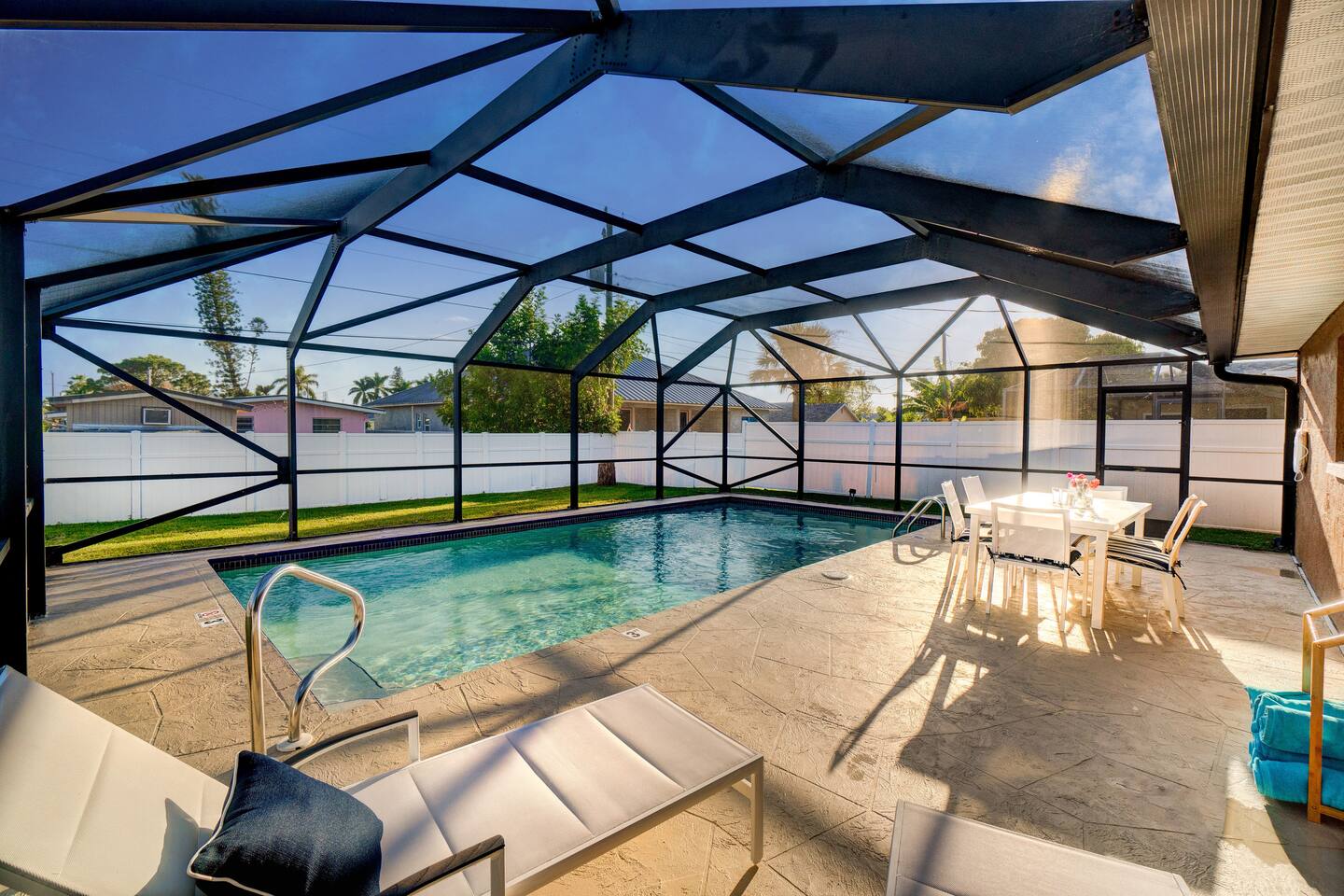 ★ Newly Renovated and Remodeled ★ 》Keyless code entry to home 》3 bedrooms (king, queen, twin over full bunk) 》All beds come with both firm and soft pillows 》2 newly remodeled bathrooms (master bath, guest bath) fully supplied with body wash, shampoo & conditioner, hair blow dryer, toilet paper, fresh towels & washcloths 》High-speed WiFi / internet - 400 Mbps 》Roku TVs in the livingroom, covered back patio, and all 3 bedrooms 》Nintendo Switch with games for the kids 》Large heated pool with 2 chaise lounges 》Enjoy dinner at the poolside dining table 》Pool and beach towels provided 》When you return from the beach, you can drop your towels and beach chairs off in the mini garage located at the front of the house and use the extra-large capacity washer and dryer 》Custom kitchen with wine fridge, wine glasses, wine opener, paper towels, trash bags, silverware, plates, bowls, cups, cookware, bakeware, etc! 》Start your morning at the coffee bar which includes mugs, Keurig/Nespresso maker, espresso pot, coffee grinder, French press, kettle, and tea pot 》On your nights in, pull out the board games and cards included for your use 》Pack 'N Play, highchair, infant bathtub, etc available upon request 》Short ride to the most amazing restaurants, shopping, and markets! 》28 minutes to Fort Myers Airport, 20 minutes to Naples Airport